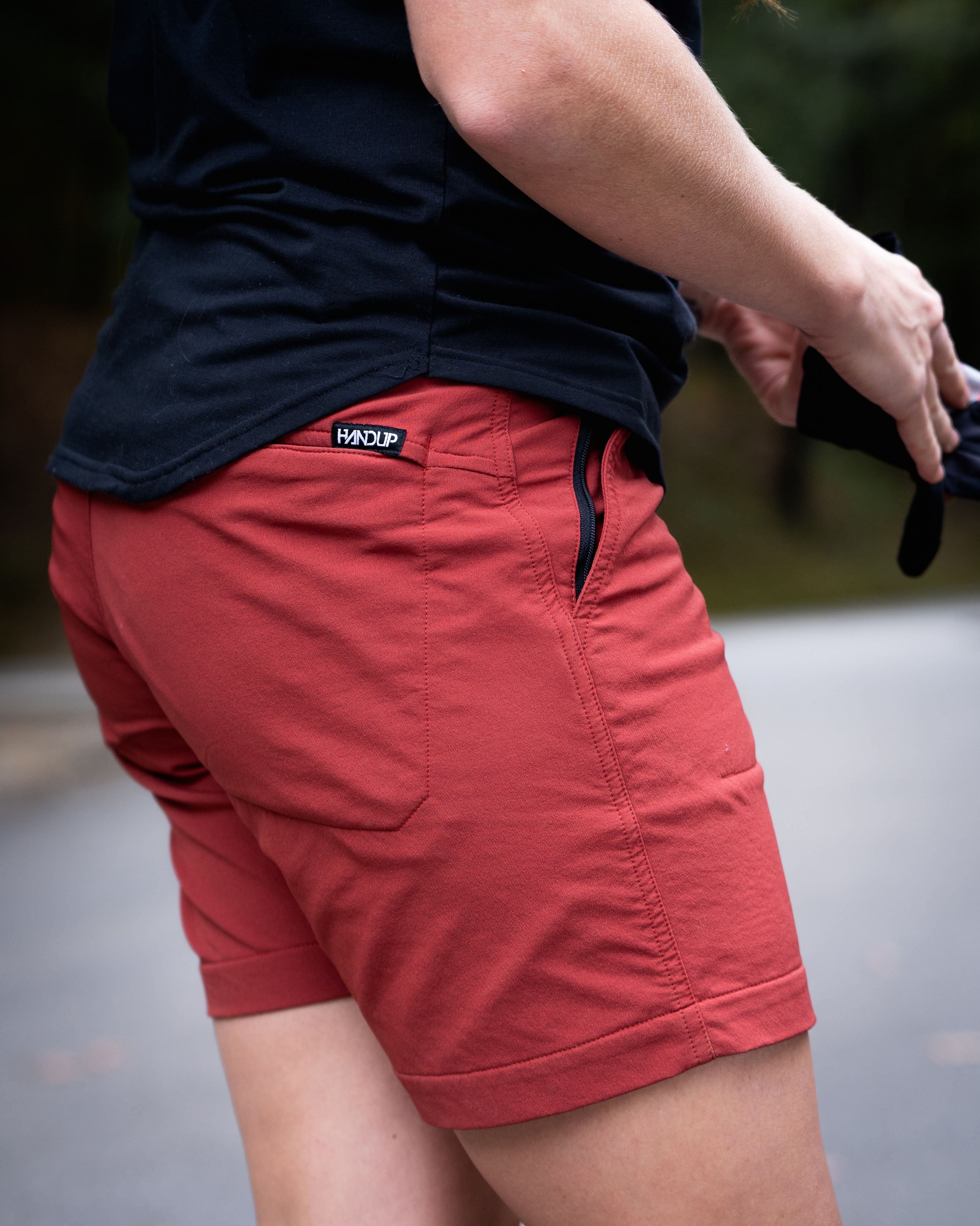 As the female co-founder of HANDUP, Jamie wanted a riding short that wasn't your typical long inseam riding short. Something short enough to look normal if wearing it casually, but also long enough to provide some "rubbing" protection on the bike.
