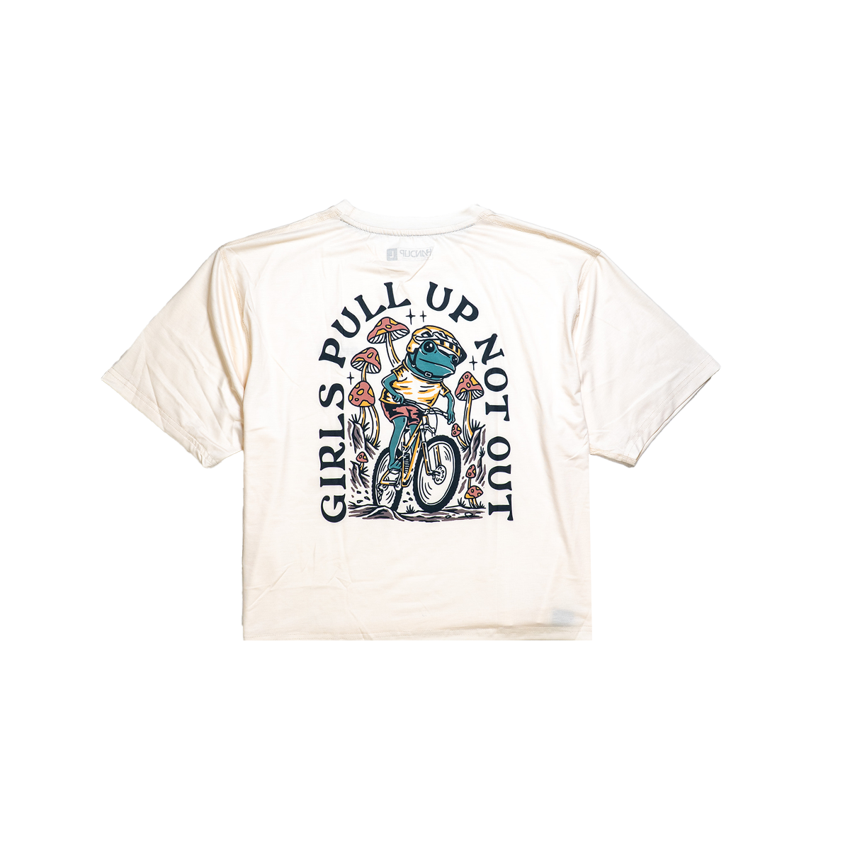 Introducing the Girls Pull Up Not Out collection. A limited drop by the funniest Instagram MTB Meme account straight from the underbrush. Covered in frogs, fungi, ferns, and just enough bad decisions to keep things interesting. A design inspired by late-night trail memes, forest creatures, and unmedicated bike decisions, the GPUNO pattern is for women and men alike but only if you're rippin' through the forest screaming "weeeeee!"