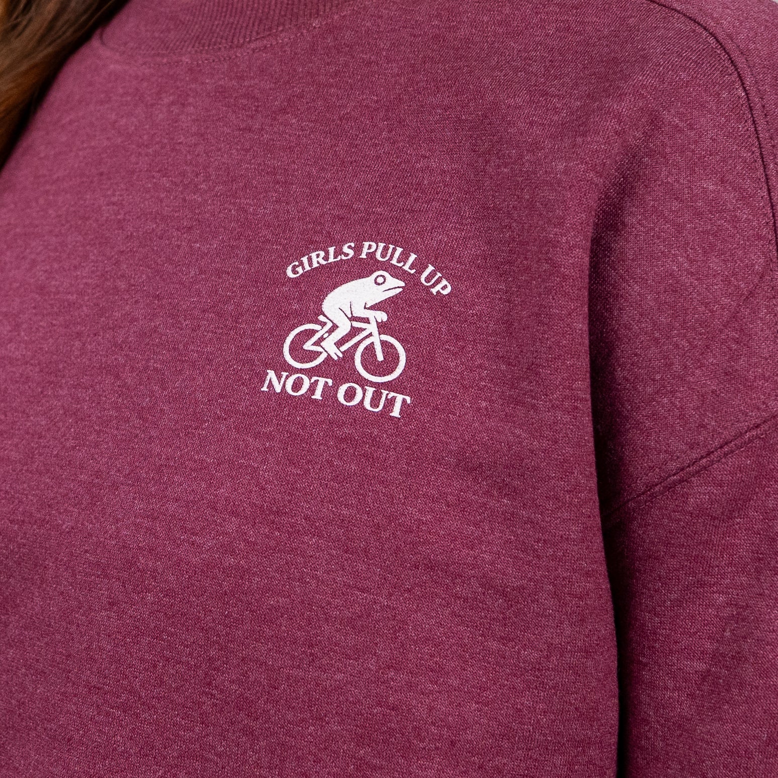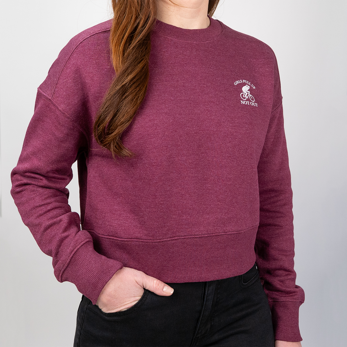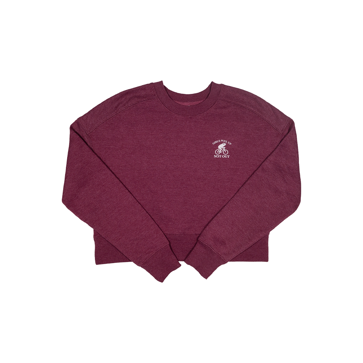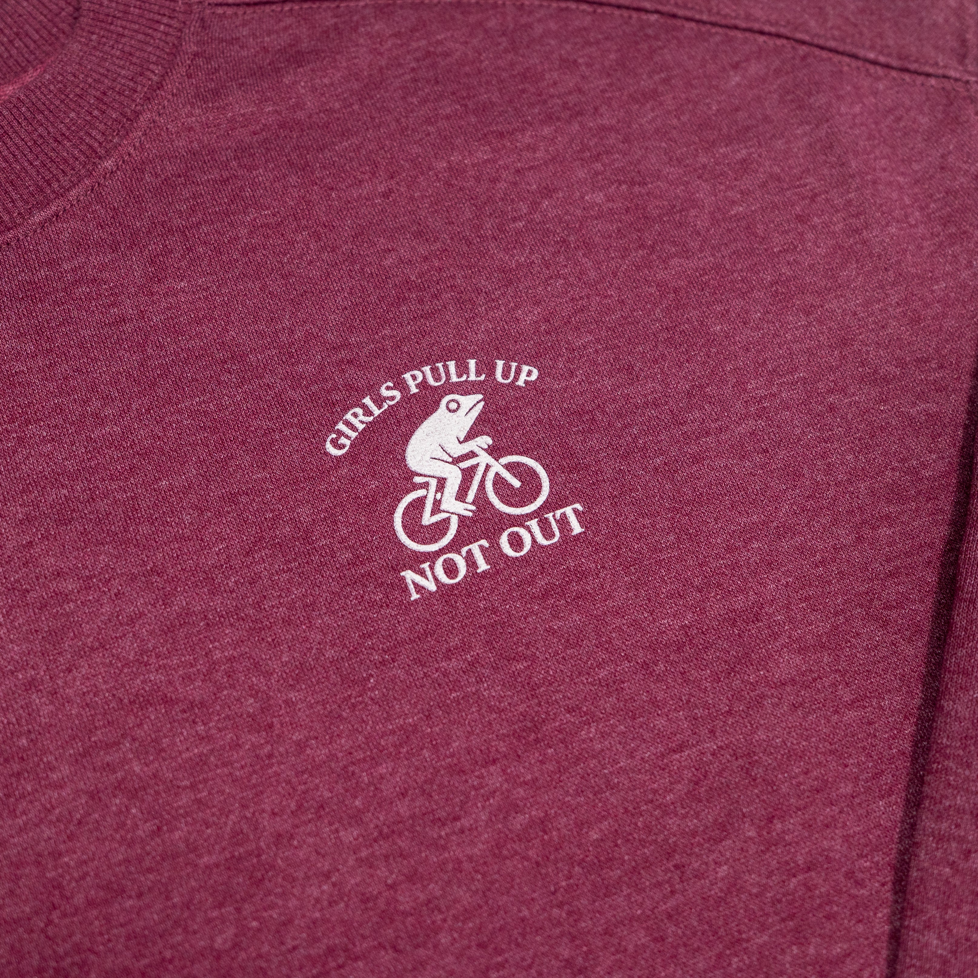 A limited drop for the cold weather from the ladies at Girls Pull Up Not Out. Stay warm and lookin' classy with 8 oz fleece cropped crew neck sweater donning the vintage biking frog logo.