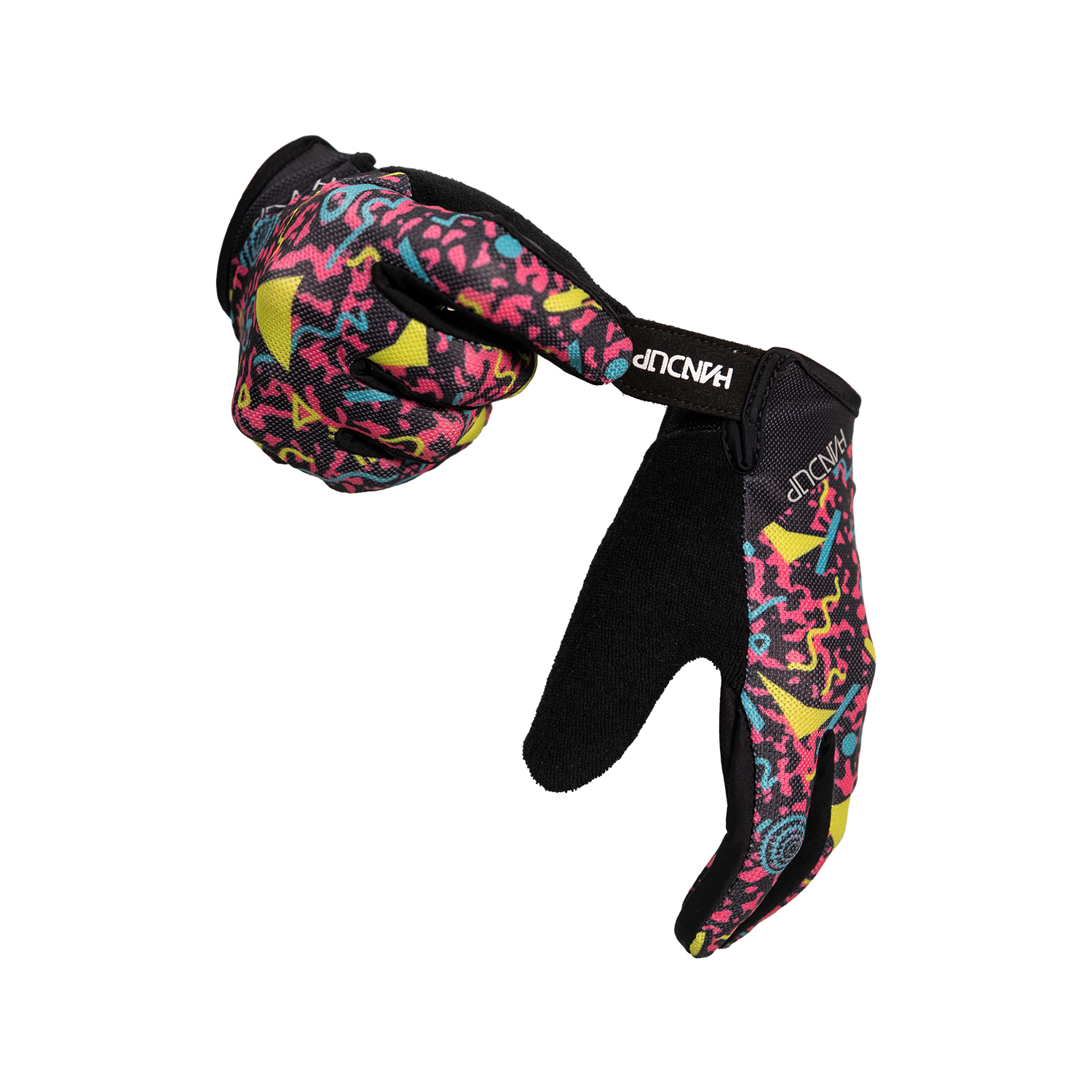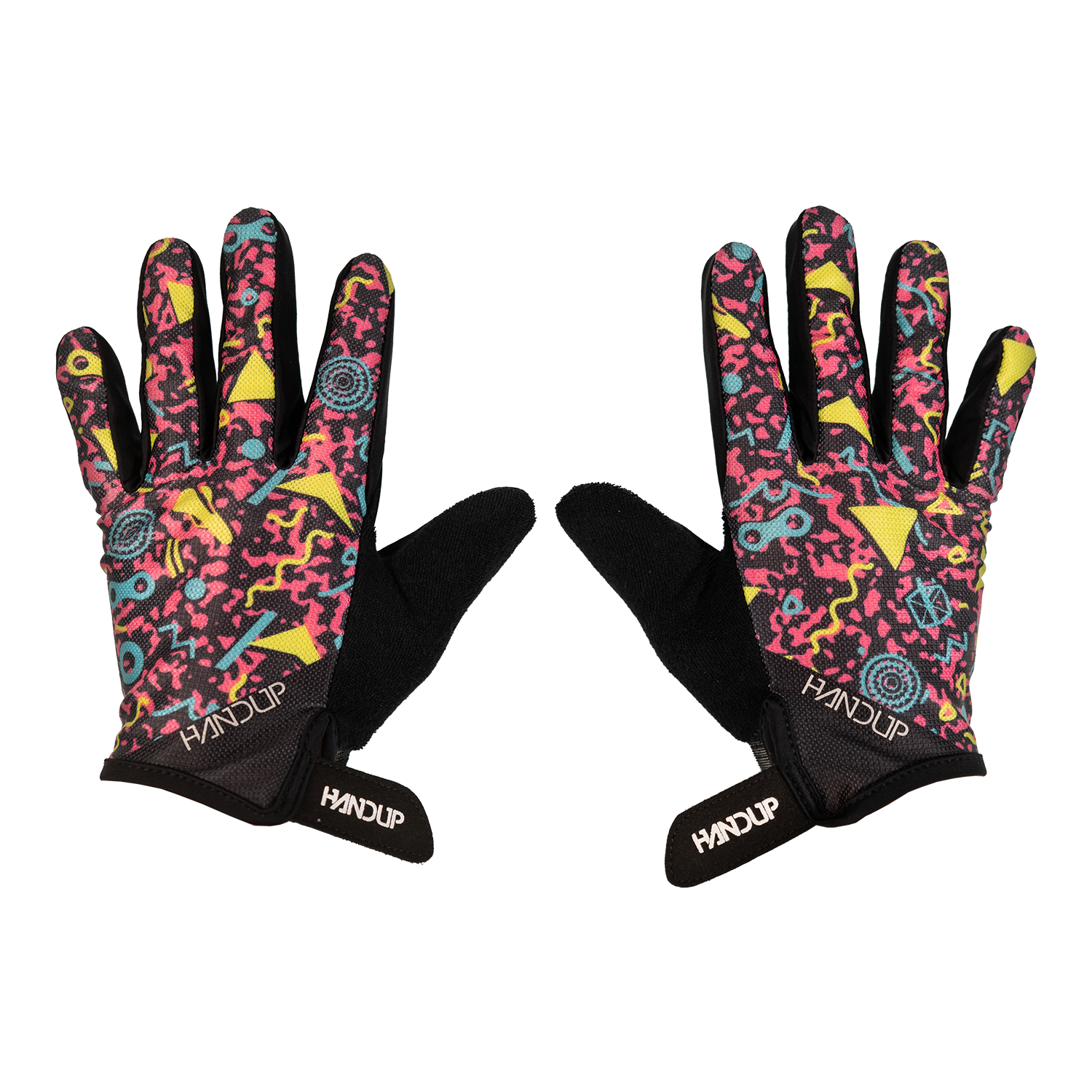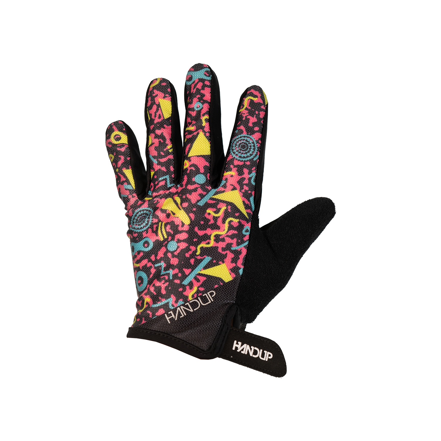 Straight from the roller rink to the trail, these are a full-send throwback to the bright, geometric chaos of ’90s roller rink carpets. Neon colors, wild shapes, and vibes you could feel through your socks, if you ever skated under blacklights while bad pop music blasted, these gloves are for you!